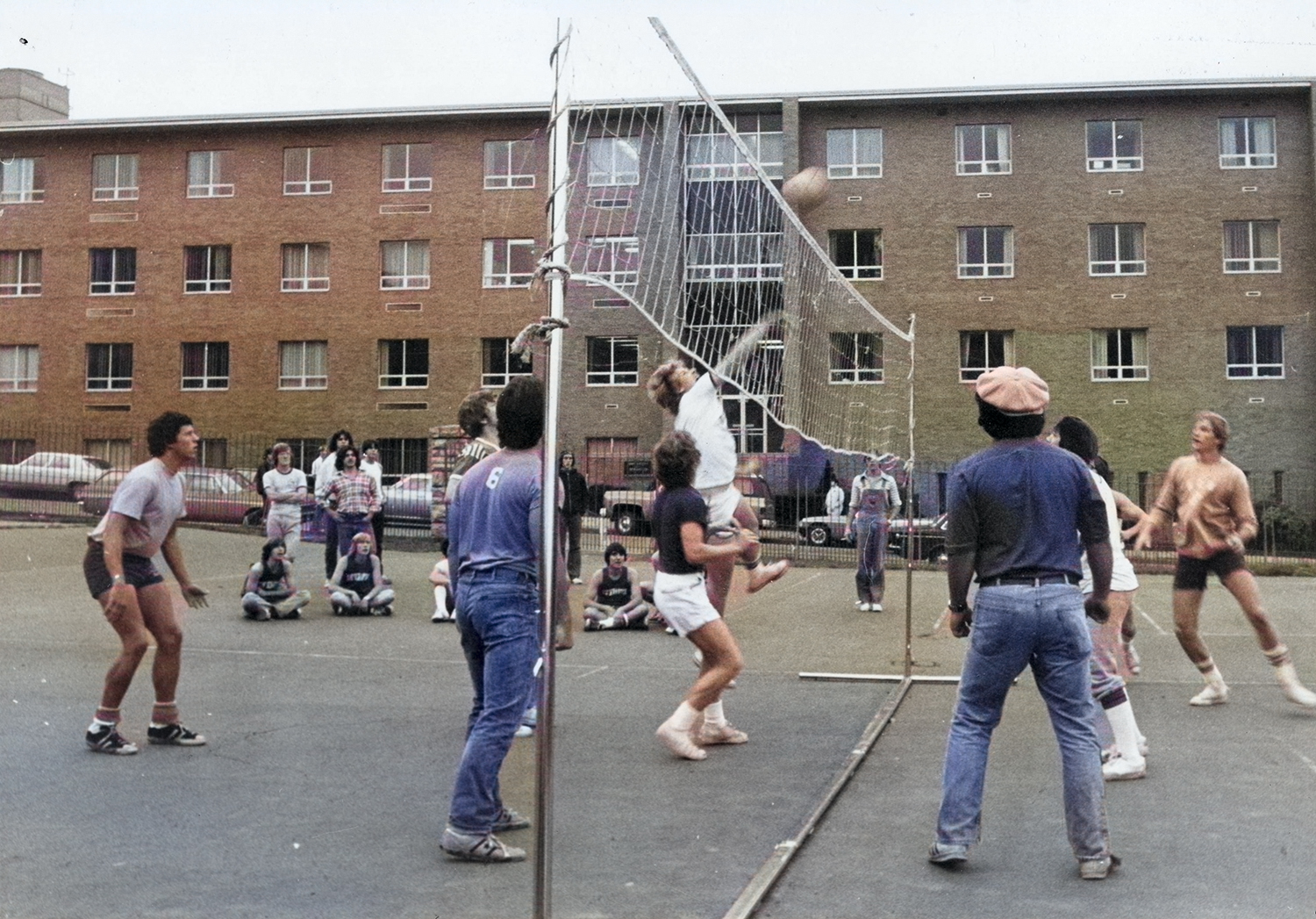 Galvin Terrace Volleyball Game, 1976, with St. Thomas Hall in background