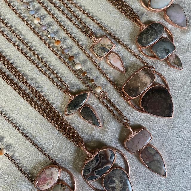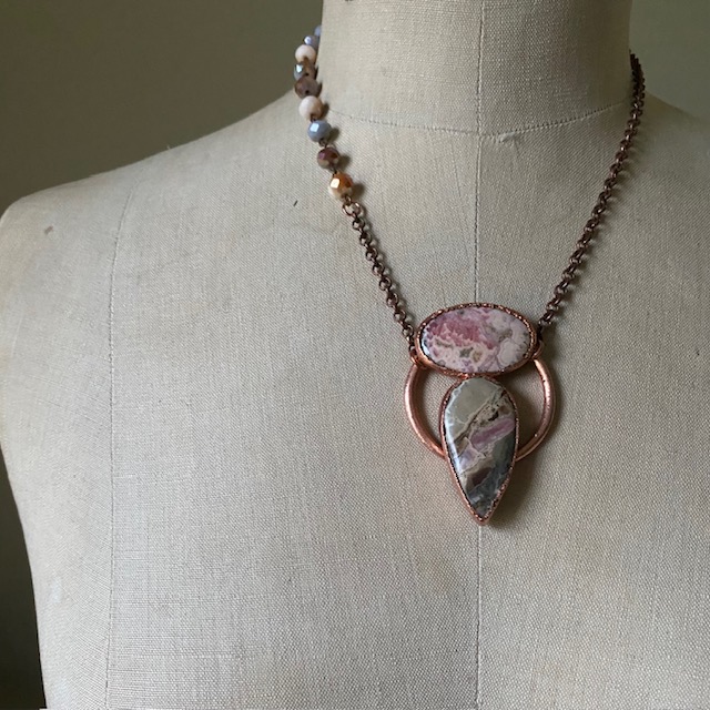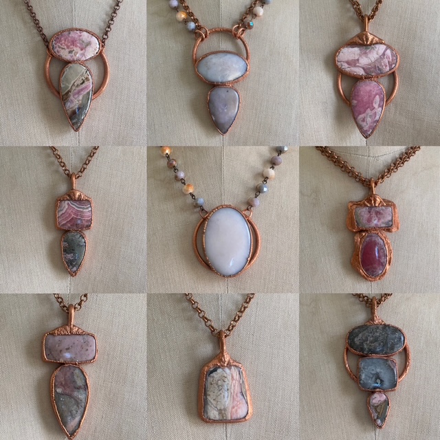 The Grand Canyon Dream Collection is comprised of a variety of hand designed jewelry inspired by the colors, shapes and textures observed among the geological grandeur of the Grand Canyon South Rim during my visit December 2024. Using photographs as reference I outsourced rhodochrosite and pink opal cabochons that reflected the changing pink and brown palette of the landscape. Each piece was hand designed and then electroformed in copper adding to the rustic aesthetic. The process of creating the collection allowed me to reconnect to the landscape reinforcing my positive lived experience and time immersed among the canyon.